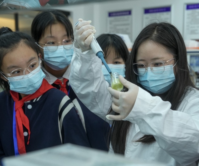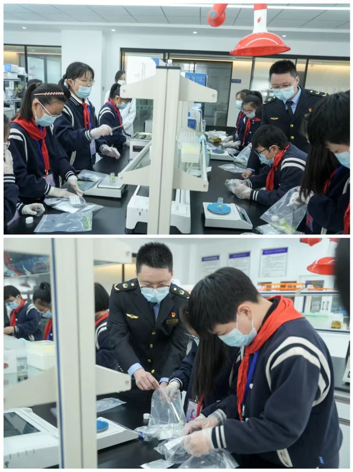 检测室内,检验员耐心给队员们讲解并实际操作了蔬菜中的甲基异柳磷的快检过程。队员们纷纷化身“小小检验员”,积极投入到动手体验中,在工作人员的指导下反复尝试,最终顺利完成了蔬菜中农残快检实验。