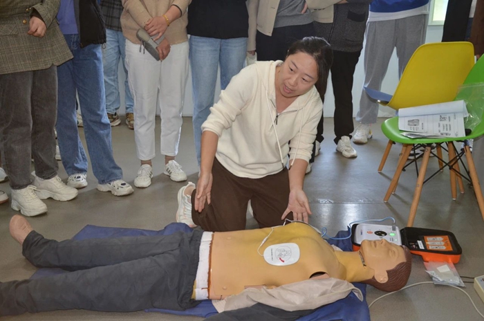 培训中,校医对相关急救知识及自动体外除颤仪(AED)的使用进行授课,重点讲解急救基础知识和心肺复苏流程步骤,介绍了自动体外除颤仪(AED)的使用方法,以及如何抓住最有效的“黄金四分钟”挽救生命。