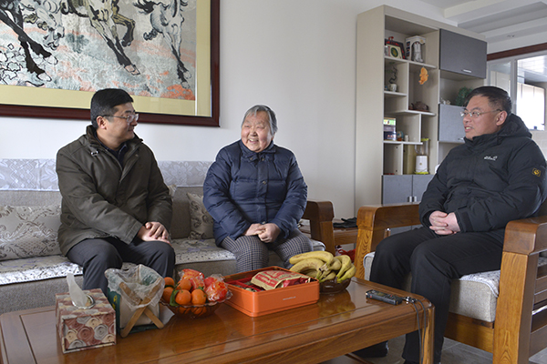 2月11日下午,在实验小学退休老教师王希娟家中,姜小军和副局长姜凌与老人亲切握手,促膝交谈。姜小军说:“实验小学请你们给青年教师讲老一辈教育人的教育故事,这个活动开展得好!青年教师就是要学习老一辈教师关爱学生,帮助学生成长,无私奉献的精神。当代青年教师弘扬老一辈教师的师风师德,需要你们的教育和引导。学校要安静,老师们也要安静,校园外面不管如何喧嚣,老师都要守住自己的本心。心安静下来了,校长才能办好学校,教师才能教好学生。王希娟非常赞同姜小军的观点,她说每个老师都要讲好自己的故事,大家在轻松和谐的氛围中相互学习,取长补短,让教育的幸福在校园里潜生暗长。临行,姜小军祝老人身体健康,新年快乐!