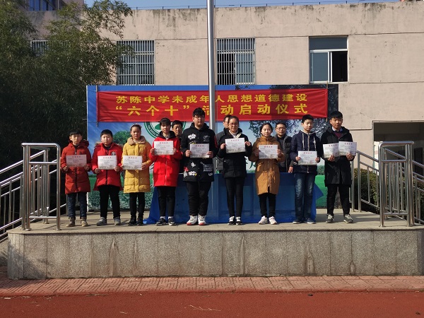 会唱10首优秀歌曲,观看10部优秀影片,阅读10部优秀书籍,会讲10个英雄人物事迹,进行10项社会实践活动,参加10次社会公益活动。苏陈中学举行新学期开学典礼,启动“六个十”活动。学校领导要求同学们积极参加到“六个十”的活动中去,从现在做起,相互督促,共同进步。