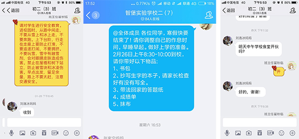 智堡实验学校在开学前几天,班主任就通过微信和家长们沟通,督促孩子们及时完成寒假作业,做好上学的各项准备工作。正式上课的第一天,又用微信提醒家长让孩子尽快‘收心’,建议家长不宜给孩子太长的学习“过渡期”,要鼓励孩子迅速进入学习状态,在布置学习任务时,不要一下子布置得太多,应让孩子有坡度地适应。