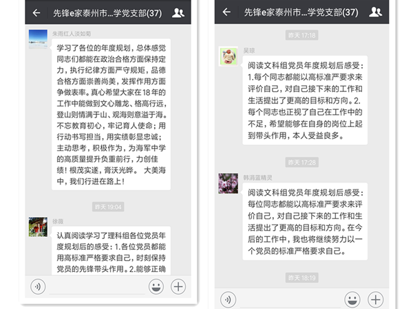 近日,海军中学的党员教师纷纷在“先锋e家泰州市海军中学党支部”微信群中发言,畅谈自己对党员同事的个人年度规划的感想和评价,对自己如何争做“四个合格”党员的想法做了交流。