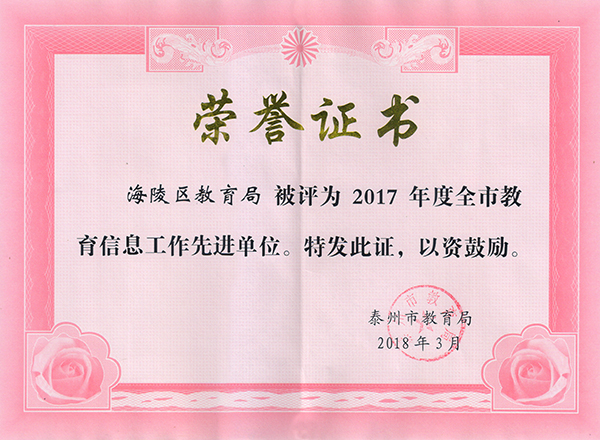 近日,泰州市教育局召开信息工作会议,会议对2017年度全市教育信息工作先进单位和先进个人进行了表彰。海陵区教育局被评为全市教育信息工作先进单位,信息撰写、报送的负责人吕春霞同志被评为先进个人,并向大会作交流发言。