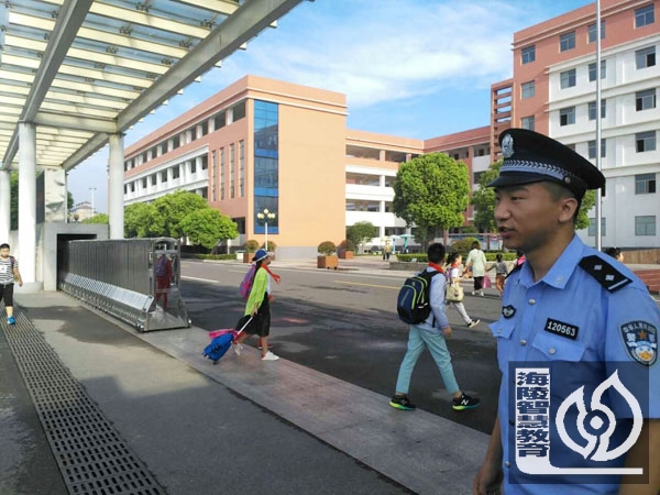 城东派出所的赵警官来到智堡实验学校的护学岗,护送孩子们进校园。
