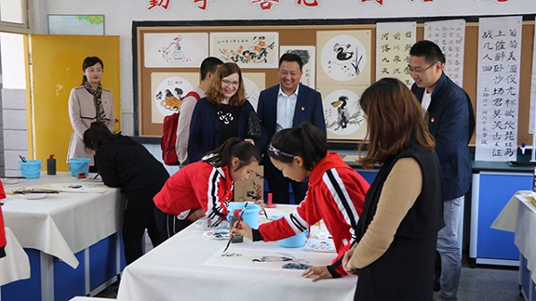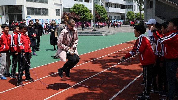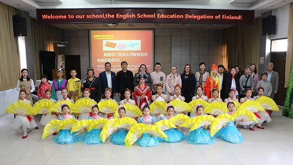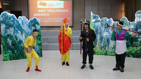 教学研讨结束后,代表团参观了国际交流展板、校史楼、篆刻、书法、国画社团的活动。同学们把自己的篆刻、书法、绘画作品赠送给代表团,并为代表团表演合唱、英语情景剧、京剧说唱、趣味拍球、八字绕长绳等活动节目。SeijaNyholm甚至情不自禁地加入同学们的跳绳队伍,欢快地跳起来。