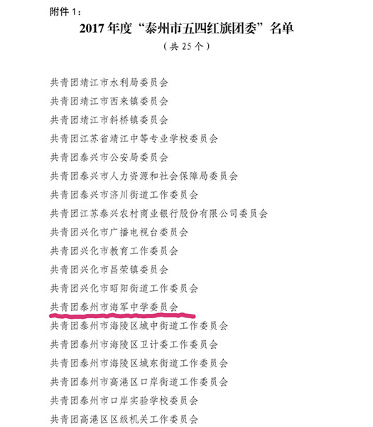 海军中学团委获评2017年度“泰州市五四红旗团委”