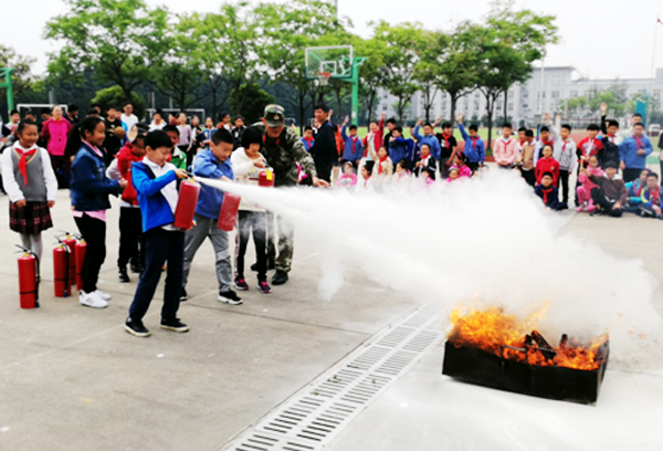 5月9日9:9演练开始,火灾警报响起,消防支队队员在东侧教学楼教室门口燃放烟幕弹,在课堂任教的老师立即指挥学校撤离教室,学生从教室的前后门疏散,面向疏散方向成两列纵队集合”。整个演练过程组织有序,学生从教室撤离到操场用时3分28秒,教师在确认无人遗留后最后离开教室。9:30,三、四年级小学生又参加了应急消防安全知识讲座和灭火器使用操作。