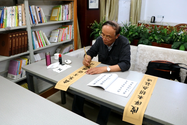 讲座后,宋雪君现场泼墨挥毫,创作了一副对联,临摹了三幅丰子恺先生的漫画作品赠予学校。