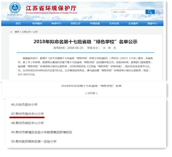海光小学被命名为省级“绿色学校” 来源:海光小学 作者:景秀 发布时间:2018-07-20 浏览次数: 次 【字体:小 大】 6月25日,江苏省环境保护厅公布了第十七批省级“绿色学校”名单,泰州市海光中心小学榜上有名。 一直以来,海光小学非常注重学校的绿色发展,常态化的开展有效环境教育活动,创设环境保护的文化氛围,促进师生、家长共同参与环保公益活动。在实现基本教育功能的基础上,在全面的日常工作中将学校的可持续发展思维纳入管理中,全面提升育人环境质量。 分享到: 【打印正文】 相关内容