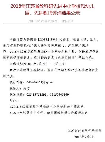 近日,江苏省教育科学研究院公示全省中小学和幼儿园教科研先进学校、先进教师名单,泰州市大浦中心小学在名单之列。