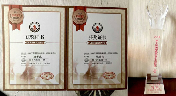 初生牛犊不怕虎。比赛中,唐箐池敢闯敢斗、勇于拼搏,桂羽佳冷静细致、稳打稳扎,两人可谓最佳搭档。经过五天9轮的激烈比赛,最长的一轮比赛达3.5小时,短的也都在2小时以上,最终她们以6胜3平积15分的成绩获得该组冠军。其中桂羽佳7胜2平,唐箐池5胜2平2负,成绩相当不错。