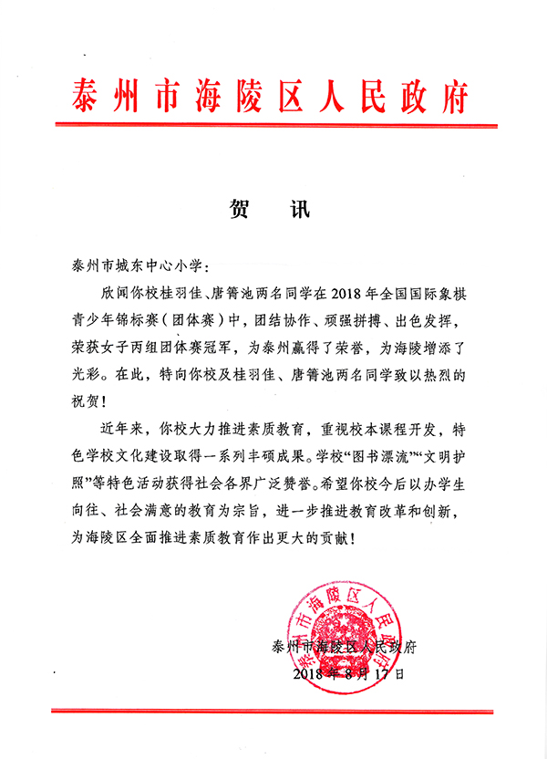海陵区人民政府为此向桂羽佳和唐箐池两名同学以及她们所在学校——泰州市城东中心小学表示祝贺,祝贺他们为泰州赢得了荣誉,为海陵争得了光彩。