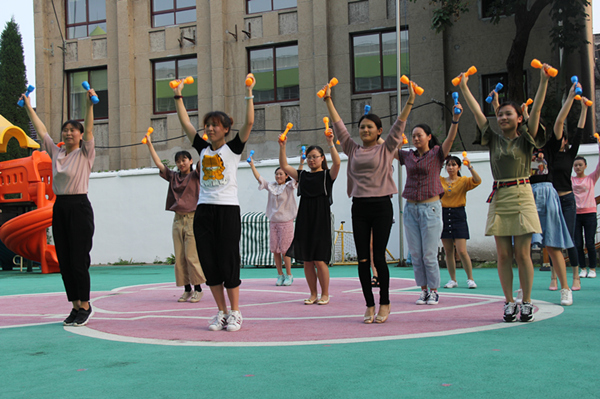 泰州市幼儿园教师创编幼儿广播操 来源:市幼儿园 作者:姚雅雯 发布时间:2017-10-12 浏览次数: 次 【字体:小 大】 新学期开始后,泰州市幼儿园的老师们为小、中、大班幼儿各创编了一组徒手操和器械操。教师们用儿童哑铃、短绳和泡沫垫,创编了动作有趣,队形变化多的幼儿早操,极大地调动了幼儿的运动积极性。此次新操的运动量和动作变换都与以往有所不同,幼儿在快乐的跑跳中提升了体能、锻炼了动作的协调性。 创编早操是市幼儿园的传统,近五年,市幼教师遵循课程游戏化的要求,对早操进行改革,融入游戏元素,创编出一系列游戏化早操,深受小朋友的喜爱。 分享到: 【打印正文】 相关内容