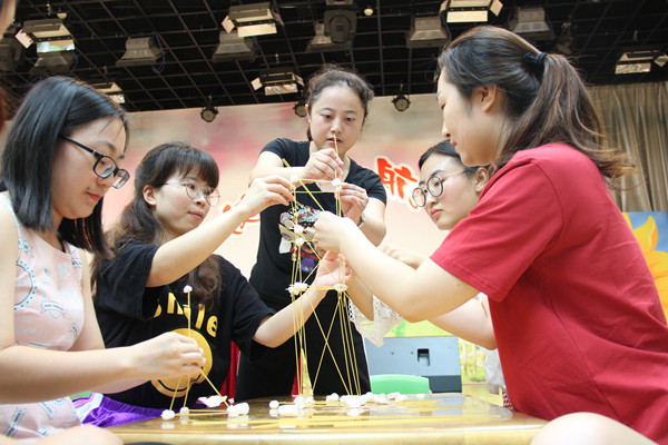 没有完美的个人,只有完美的团队。学校的工作千头万绪,靠一个人的力量是无法完成的,集体的智慧和力量才是无穷的。开学前,为培训老师的团队合作精神意识,实小附幼举行了首场团队合作训练,老师们用棉花糖和小竹签搭高塔,获胜的一组成绩是1.1米。