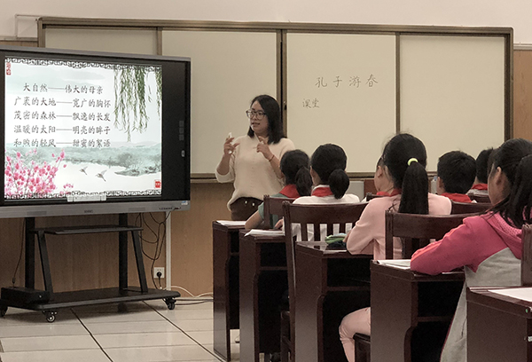此次活动分为两大部分。首先是工作室的两位成员,陈梅老师和徐新老师分别带来了两节展示课。第一节是陈梅老师执教的《孔子游春》,从孔老师的课堂环境、教学内容入手,立足文本引导学生逐步去发现智者课堂的与众不同,从而感受智者的善施教化。