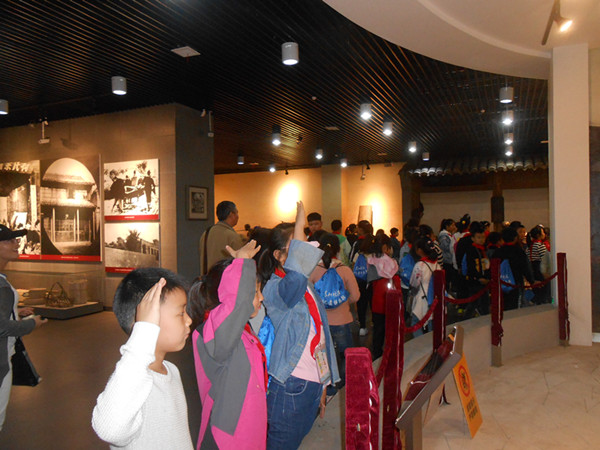 经过40分钟行程,孩子们走进了充满了古色古香气息的中共江浙独立支部纪念馆。“要找共产党,就到刁家网。1924年初,沈毅受党的指派,到泰兴传播革命真理,开展农民运动。”工作人员介绍说,“宫殿式展览大厅分为中、东、西三厅,采用雕塑、油画、照片、实物、展板、展柜、电子图表等表现方法,再现了70多年前那段可歌可泣的历史。”