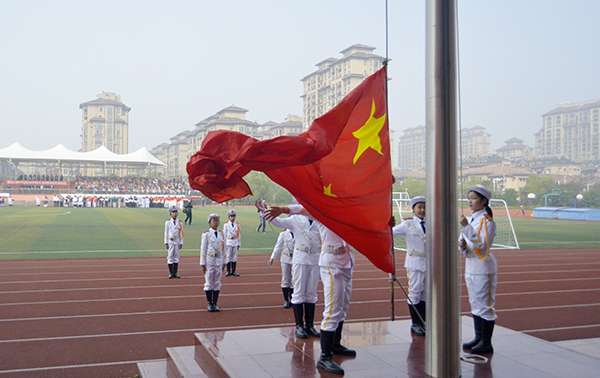 庄严的升国旗仪式开始了,主席台上的领导,全体裁判员、运动员立正,面向东方,凝神注目国旗即将升起的地方。雄壮的国歌声响起,鲜艳的五星红旗在太阳的映照下冉冉升起,整个操场充满了昂扬的生机。