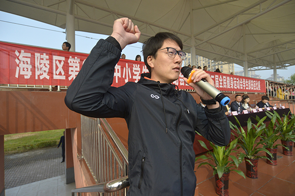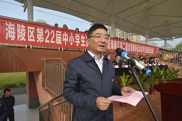 升旗仪式毕,姜小军向运动会致辞。他说,近年来,区委、区政府把教育放在优先发展的重要地位,不断加大教育投入力度,在各级部门的关心支持下海陵区的体育工作取得了丰硕的成果。据悉,海陵区中小学运动员在全国国际象棋,省中小学生田径运动会以及乒乓球省级赛事中都取得了骄人的成绩。姜小军希望全体参赛运动员秉承“更快、更高、更强”的体育精神,发扬优良的体育道德风尚,在运动场上赛出风格、赛出友谊、赛出水平,充分展现全区中小学生的精神风貌。