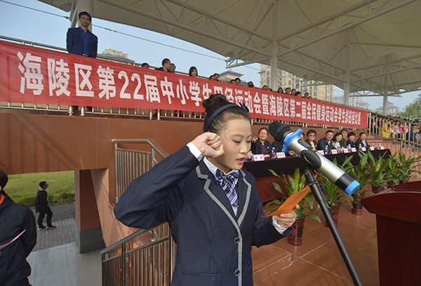 随后,运动员代表王绘雅,裁判员代表邱晨分别宣誓:全体运动健儿,一定会赛出水平,赛出风格,为海陵区中小学再创辉煌;让每一位运动健儿的真实水平在本次运动会上得到最公平的体现。