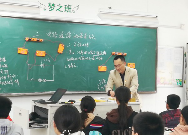 活动中,燕桂强执教了《电路连接的基本方式》。他的课从“激趣”——情境创设、“探究流程”——梯度设计、“练评反馈”——夯实基础、“课外实践”——延伸思考、“课外作业”——巩固提升几个教学流程演绎有效知识梯度的建构,引导学生从简单电路认识到复杂电路设计,观察并解决认知缺陷,体现合作探究激发思维、突破教学难点的作用,为常态教学设计做了较好的范例。
