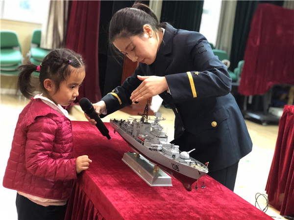 讲解结束后,讲解员和孩子们互动,回答问题正确的小朋友得了纪念品,他们纷纷表示长大以后要当一名中国人民解放海军。