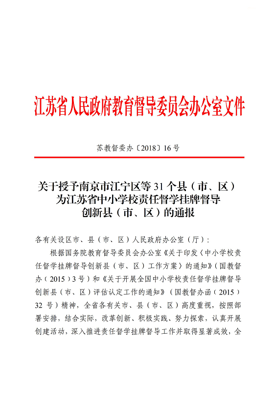 11月12日,省政府教育督导委员会办公室正式发文认定31个“2018年度江苏省中小学校责任督学挂牌督导创新县(市、区)”,海陵区榜上有名。