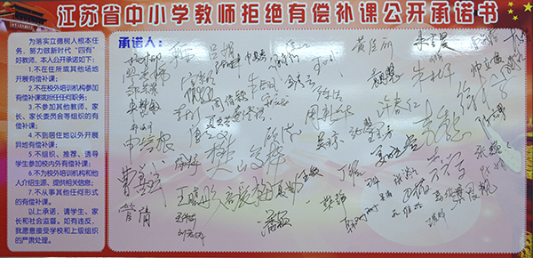 11号23号,在海陵区传承“教师妈妈”精神师德巡回报告会上,全区中小学、幼儿园教师代表现场签订拒绝有偿家教公开承诺书,向全社会庄严承诺,拒绝校外兼职,拒绝有偿家教,规范从教行为。