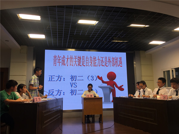 “东园杯”校园辩论赛是二附中传统学生活动,已经持续开展了多年,深受师生的关注。在比赛之前,学校团委组织辩手、计时员进行统一培训,希望各班代表队能在比赛中有精彩的表现。最终,初二(8)班以绝对优势战胜了对手,赢得胜利。