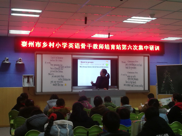 12月7日,泰州市乡村培育站小学英语教学研讨活动在苏陈实验小学举行,本次活动研讨的主题是“基于思维导图和文化意识培养”。 活动中,苏陈实小唐丽芳老师和卫海霞老师同题异构四年级上册《Unit7 How much?》,大冯中心小学的叶艳老师执教的四年级上册《Unit 8 Dolls》,九龙实验学校唐继新老师执教五年级上册 《Unit8 At Christmas》第二课时的教学。课后,实验小学副校长、省小学英语特级教师姜建宇对四位老师的课做了精彩点评,她指出每节课课前要把好听读关,课上要动静相宜,课后拓展要注意延伸,突破知识中的传统观念,敢于创新。