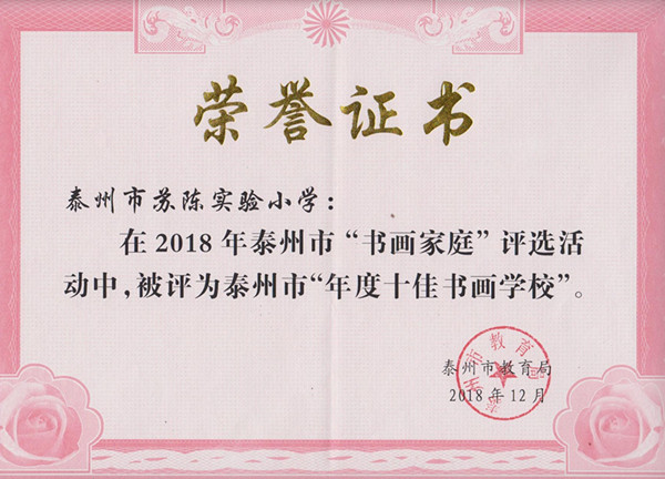 苏陈实小获评泰州市“年度十佳书画学校”称号 来源:苏陈实小 作者:刘小运 发布时间:2019-01-10 浏览次数: 次 【字体:小 大】 近日,从泰州市教育局传来喜讯,苏陈实小被评为泰州市“年度十佳书画学校”,是海陵区唯一获得此荣誉称号的学校。校长郑兴河被评为泰州市“十佳书画领航校长”。 据介绍,2014年苏陈实小成为江苏省首家少儿书画训练示范基地,学校紧紧围绕立德树人根本任务,积极探索书画教育的德育功能,取得明显成效,数十学生在省、市、区各类书画竞赛中获一等奖。 分享到: 【打印正文】 相关内容