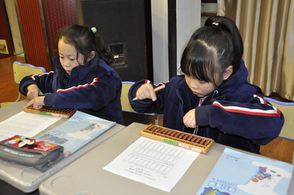 据介绍,海光小学自2017年7月被确定为“江苏省第二批珠心算教育实验学校”以来,精心挑选业务骨干加入珠心算实验团队,多次组织实验教师参加全省小学珠心算骨干教师培训班学习,并组队前往省内珠心算实验成果显著的学校学习实验经验和方法。短短一年多的时间,该校珠心算各项实验工作稳步推进。目前该校一年级孩子基本达到20以内一位数5笔加减法实拨能力,二年级孩子基本达到100以内两位数5笔加减法实拨能力和3笔加减法心算能力,社团里的孩子基本达到两位数7笔心算能力,最优秀的孩子达到一位数60笔心算、两位数30笔心算、三位数20笔心算、四位数15笔心算能力。