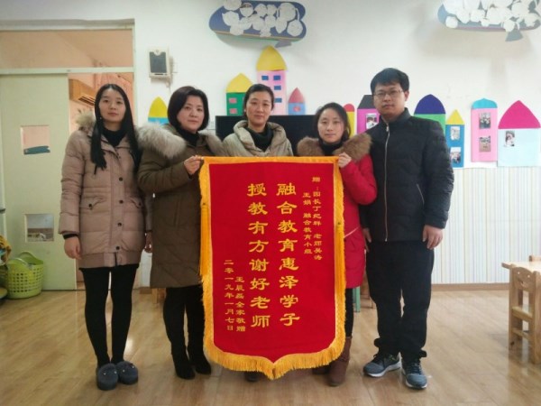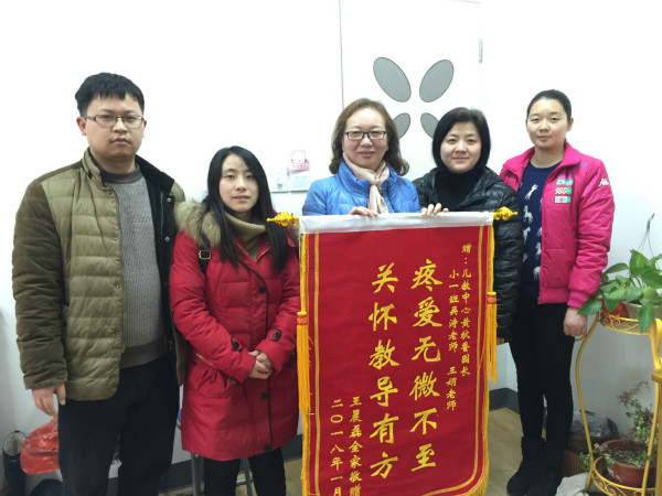 1月18日,儿教中心中(1)班幼儿磊磊的爸爸、妈妈和奶奶一起把上书“融合教育惠泽学子 授教有方谢好老师”的锦旗送给儿子的老师吴涛和王娟,她们是幼儿园融合资源小组的成员。一年前的今天,磊磊的爸爸和妈妈一起把上书“疼爱无微不至,关怀教导有方”锦旗送到幼儿园,表达对园长和老师对其子无微不至的关爱。