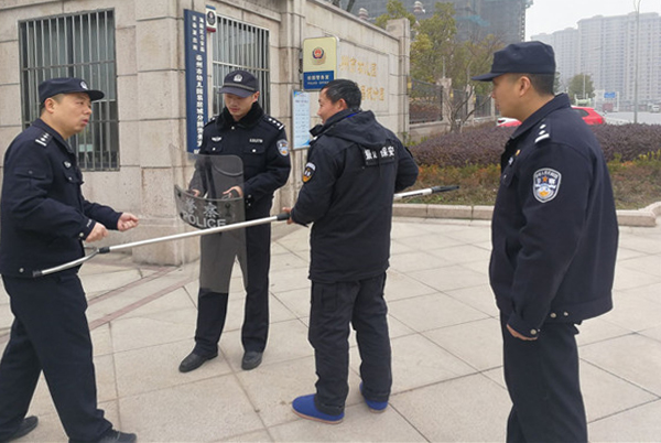 公安干警指导幼儿园安保人员正确使用防暴警械