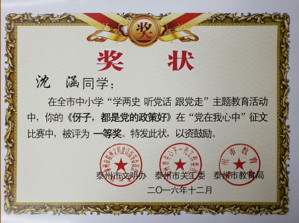 沈涵同学获市“党在我心中”征文比赛一等奖 来源:本站原创 作者:袁少华 发布时间:2017-05-26 浏览次数: 次 【字体:小 大】 在全市中小学“学两史 听党话 跟党走”主题教育活动中,民兴中学小学部六年级3班的沈涵同学在薛晓凤老师指导下撰写的《伢子,都是党的政策好》被评为一等奖。泰州市文明办、泰州市关工委、泰州市教育局联合颁发奖状。 分享到: 【打印正文】