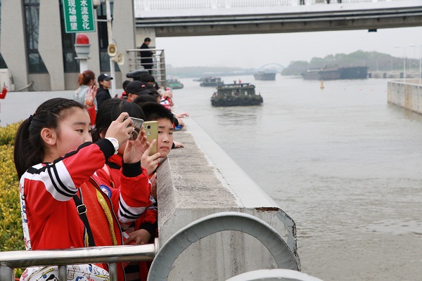 在江苏省泰州引江河工程管理处,同学们站在大堤边,目睹万吨货轮进出闸门,充分感受南水北调工程的宏伟与神奇。