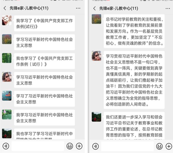 随后,党员教师们借助微信平台开展了学习心得大讨论。“作为幼儿园会计,我要在财经法规纪律的框架下履行好工作职责,管好钱、管好物,还要对资金的运行和使用行使监督管理职能,不能有半点马虎。”“通过进一步学习,我明白我们每个人都能在自己的岗位上做好自己该做的事情,做到守纪律、讲规矩,才能无愧于职责,无愧于使命。”“百年大计,教育为本;教育大计,教师为本。总书记的“三个牢固树立”的殷切希望和做好一名教师的‘四个必要条件’正体现了新的历史时期做好一名合格人民教师的新要求。因此我们要把总书记的这些讲话要求贯穿于我们教育教学的整个过程,渗透到孩子们的学习生活的各个环节中去,切切实实地做到用高尚的师德引领幼儿的全面发展。”……党员老师们纷纷在微信上留言,抒写感想。一个多小时的会散了,但微信平台的讨论并没有结束,党员们纷纷表示:“运用新媒体开展党员活动方便也很有效,能互相交流,增强沟通,挺好的!”