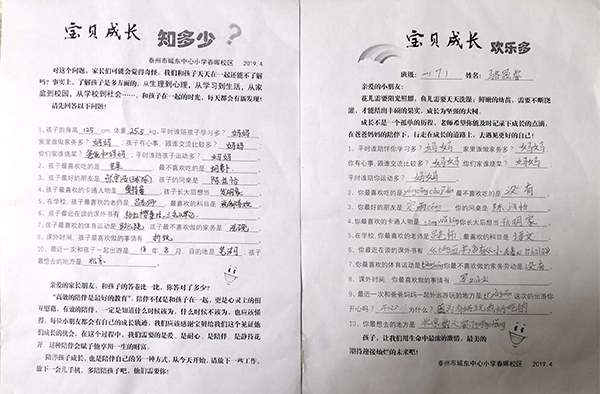 找到座位坐下后,部分班级还设计了家长要完成“宝宝成长知多少?” 一(7)班骆晟睿的妈妈完成“试题”后,深感欣慰,她说:“我的回答和孩子的答案基本一致,平时陪孩子的时间比较多,我要把这份答卷收藏好,回家带给孩子爸爸看,让他也答答,看能答对多少!”