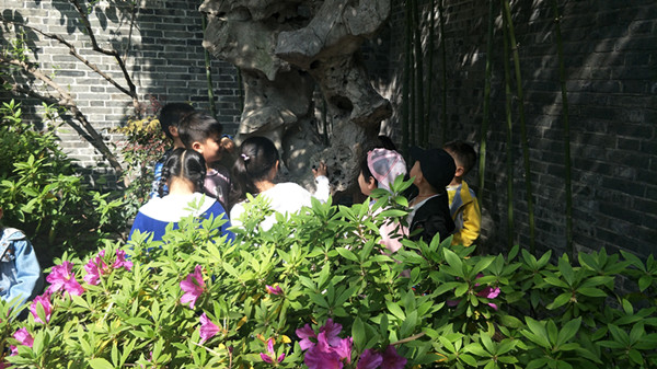 小班的孩子在泰山公园用多种感官“看春天、闻春天、摸春天”,探索春天的秘密;大班的孩子在乔园认识不同的竹子、奇石、花草,初步感受园林布景的玄妙。