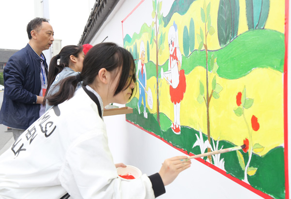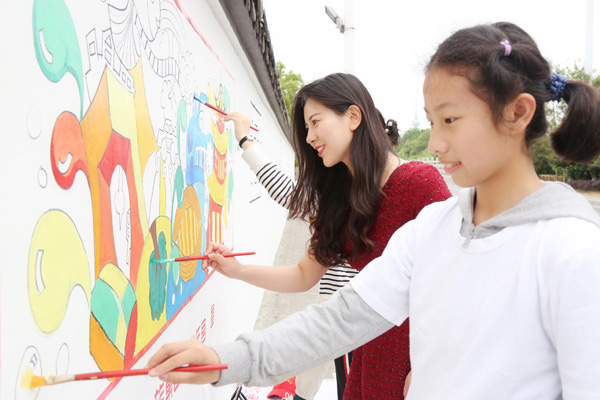 5月18日上午,泰州市少年宫书画院学员在老师的带领下到老街开展“迎新中国成立70周年”墙绘活动。