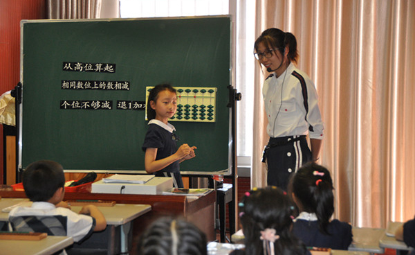 活动中,海光小学沈小燕、张秀华和戴鑫三位老师分别执教了二年级《万以内的减法(退位减)》,惠爱平老师执教了一年级的《两位数减两位数(退位减)》。惠爱平以绘本为载体,将珠心算与绘本故事完美融合,让学生在玩中学、学中练、练中思,充分感受珠心算学习的乐趣和无穷的魅力。课后,四位执教老师从教材融合、重难点突破和珠心算技能形成等方面向与会老师作了详细阐述。