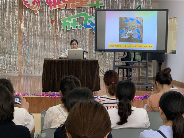 活动中,韩丽、孔雪和孙希梅三位教师分别从背景,发展,思考等几个方面介绍了自己的课程故事,主题分别是《小鸡成长记》、《有趣的植物》和《树叶探秘之旅》。