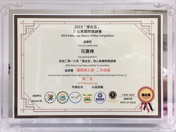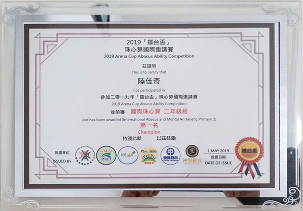 前不久,香港启学轩教育中心有限公司在香港科技园举行2019香港国际杯珠心算比賽,泰州市海光小学二年级陆佳奇和花嘉栋两位同学受邀参赛,分别夺得二年级组别的第一名和第二名。