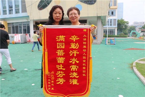 临近毕业,大浦附幼大四班游游小朋友的家长将两面锦旗分别送给园长和三位老师,上面分别写着“辛勤汗水常浇灌,满园蓓蕾吐芬芳” “倾心培育,爱生如子”以此表达对园长和老师的感激之情。