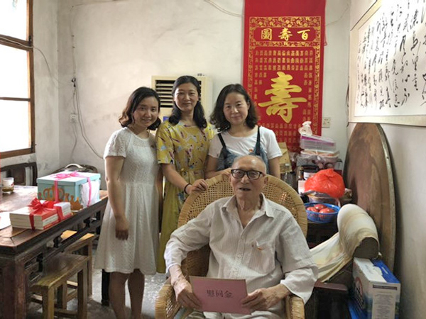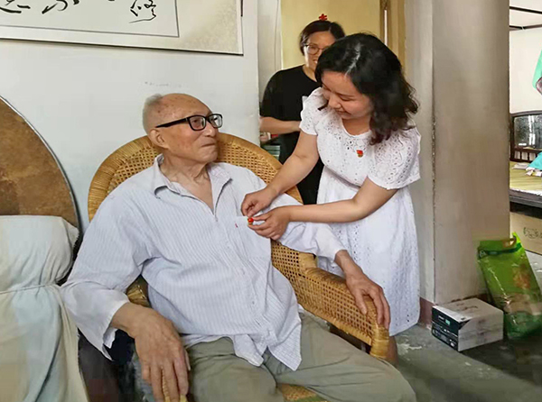 “七一”前夕,儿教中心党员教师代表带着生日蛋糕和党史书籍,为老人庆生。老师们为他佩戴上鲜红的党徽,老人笑得合不拢嘴,他说:“虽然自己今年一百岁了,但是对于党组织,他永远都记在心上。”