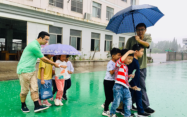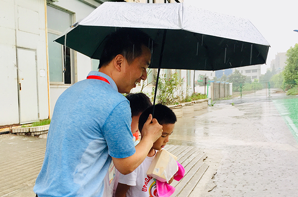 虽然只有200米的距离,但孩子们过不去啊!怎么办呢?找伞。老师们寻遍了校园的每一个地方,好不容易找来十多把雨伞和几件一次性雨衣。在值班老师的组织下,校长、老师为孩子们撑伞,来来回回……开饭的时候,388名学生一个不少在餐厅吃上了热腾腾的饭菜,有说有笑。看着孩子们开心地吃饭,老师们才开始擦拭身上的雨水。