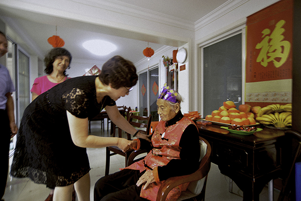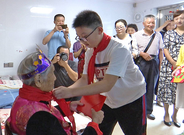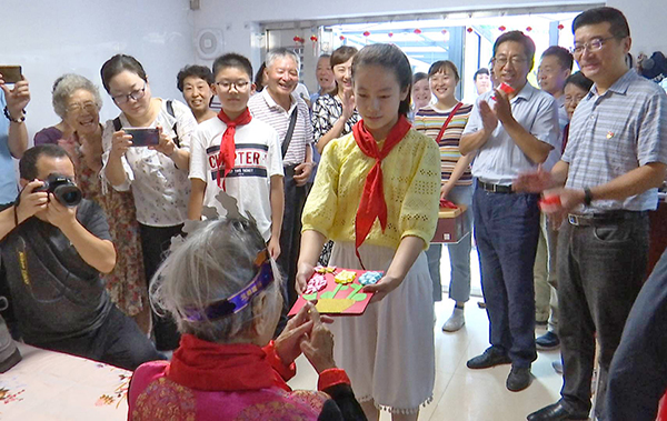 当天,孙佳玲和海陵区教育局领导、大浦小学师生一起簇拥着沈友芬老人为她庆贺百岁生日。一名男学生给沈友芬系上红领巾,一名女学生给老人献上生日和教师节贺卡。大浦中心小学何玉忠老师向她赠送了亲手书写的寿联。沈友芬老人看得眉开眼笑,开心不已,连连拱手说,“谢谢!”