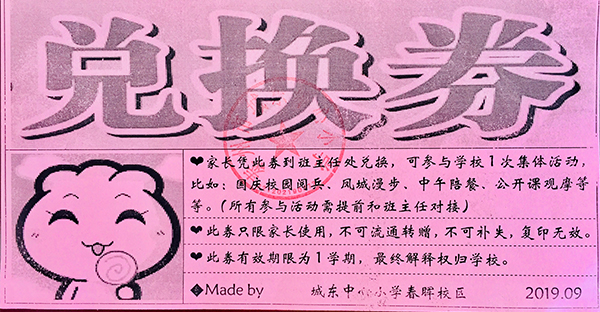 “兑换券”是粉画纸印的,有什么用呢?上面有这样的一段文字说明,大意是:如果您能积极参与学校或班级活动,学校会奖励您一张“兑换券”。今后您凭此券可向班主任老师领取“学校国庆‘阅兵’活动、凤城漫步、中午陪餐、公开课观摩”等重大活动的入场券。“兑换券”上还盖着学校鲜红的印章。