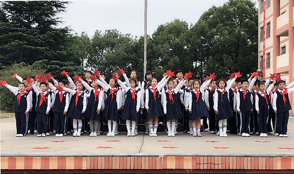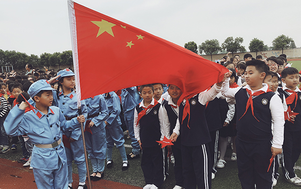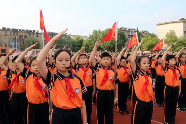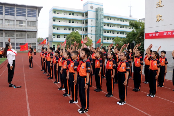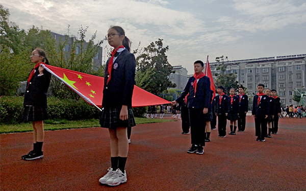 操场上,队员们佩戴着鲜艳的红领巾,鼓号队的全体队员身着演奏服装,站着“70”型的队列,整装待发。大队辅导员王小燕老师一声口令,国旗护卫队的同学们出旗,向全校师生展示了中华人民共和国国旗和中国少年先锋队队旗,国歌和少先队队歌在校园的上空回荡。王小燕带领全校师生重温少先队一系列礼仪,向鲜红的队旗致敬。