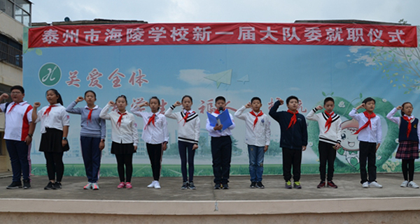 经选举,海陵学校的新一届少先队大队委就职,队干们在队旗下庄严宣誓:“一当火车头,样样事情能带头;二当孺子牛,热心办事勤奔走;三当水中鱼,团结队员做朋友;四当智多星,多出点子会创新;五当小火箭,自动向上齐奋进。我们将尽心尽力,做一名名副其实的大队委员。”