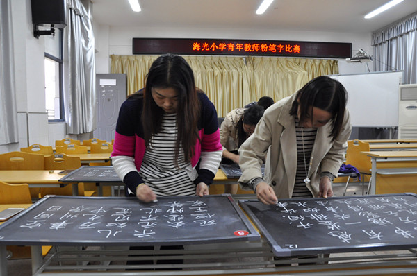 海光小学举行语文教师粉笔字比赛 来源:海光小学 作者:曹冬琴 发布时间:2017-11-02 浏览次数: 次 【字体:小 大】 一支粉笔写春秋,写好粉笔字是每个老师必备的基本功。11月1日,海光小学语文组举行青年教师粉笔字比赛,19位40周岁以下的语文老师参加了比赛,其他老师作为评委进行现场点评。 本次比赛采用选手现场抽题书写古诗,既让青年教师展示基本功,又重温经典古诗。选手们一笔一划认真书写,力求展示自己最精彩的作品。学校希望通过本次活动让老师们意识到写好一手漂亮的粉笔字对学生一生的影响,给孩子们留下童年美好的记忆。 分享到: 【打印正文】 相关内容